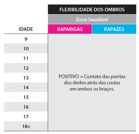 O teste de Flexibilidade dos Ombros consiste no contacto dos dedos das duas mãos atrás das costas. Este teste tem como objetivo avaliar a flexibilidade dos membros superiores.