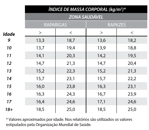 Consultar os valores de referência por género e idade. Importante: Os resultados relativos à avaliação da composição corporal do aluno deverão ser transmitidos pessoalmente nunca expondo o aluno aos restantes colegas.