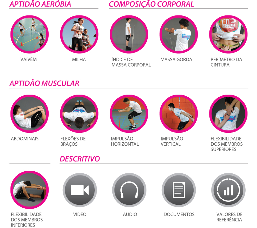Para além de recursos multimédia de apoio à realização da bateria de testes físicos, está igualmente disponível um conjunto alargado e atualizado de recursos que compreendem diferentes áreas de informação, como por exemplo a definição de conceitos relativos à alimentação e à atividade física e a divulgação de resultados científicos relevantes.